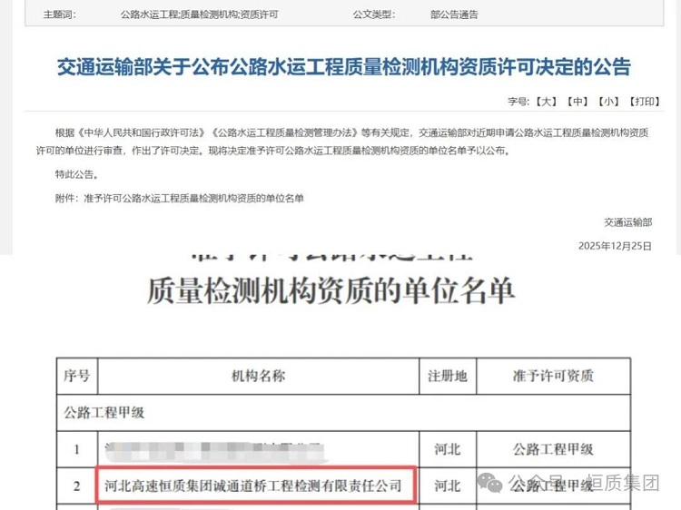 12月30日,河北高速bv1946伟德官网诚通检测公司获得公路工程试验检测甲级资质,标志着bv1946伟德官网在交通基础设施质量检测领域实现重要突破,是集团服务交通强国战略、提升核心专